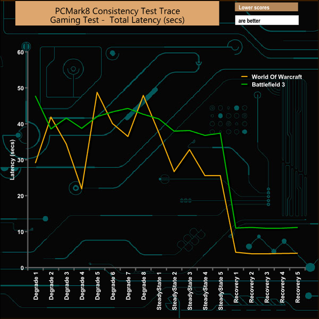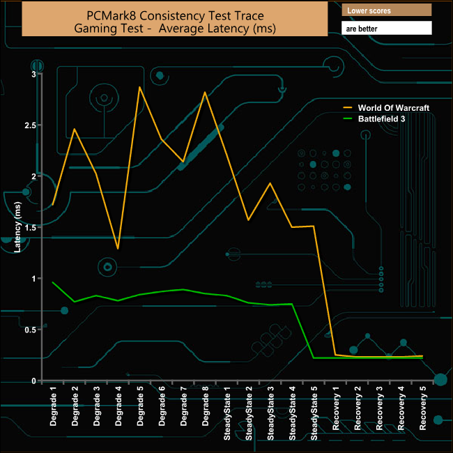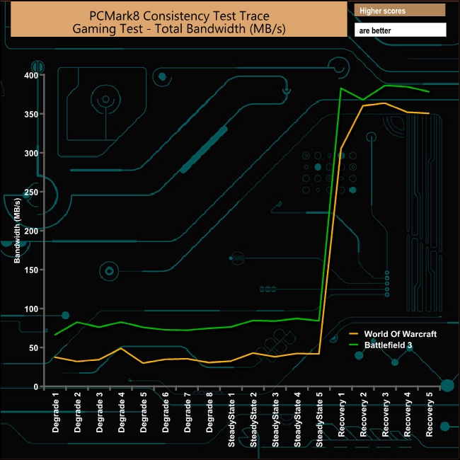 The drive takes quite a battering during the degradation and steady state phases of casual gaming test, particularly during the World Of Warcraft runs. It does, however recover very well from the ordeal, recovering a little better from the Battlefield 3 test runs than those of the World Of Warcraft.