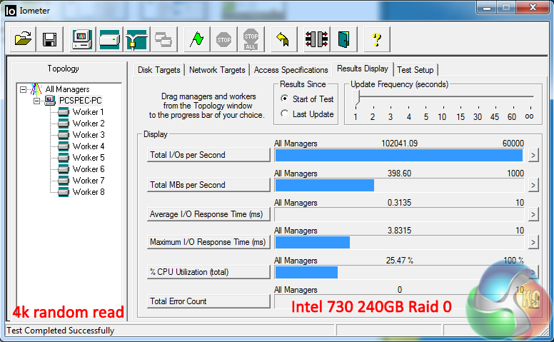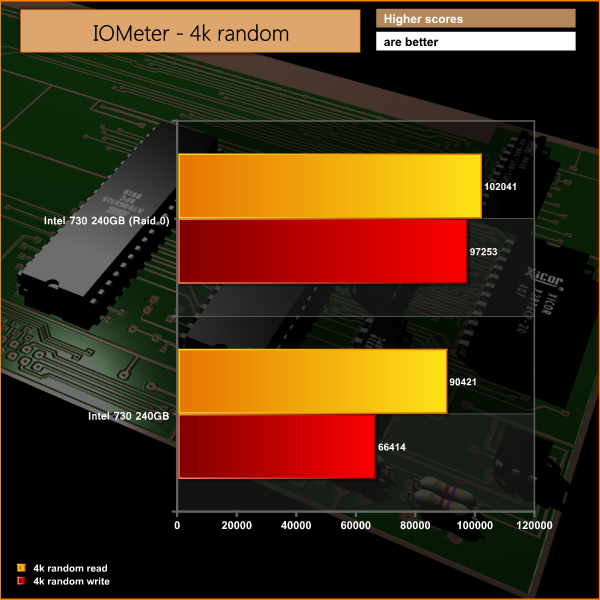 In Raid 0 the IOPS performance increases substantially, increasing to 102,041 IOPS in the 4k random read test and 97,253 in the 4k random write test. Intel’s official IOPS performance for a single drive is rated at 86,000 read and 56,000 write, so our results are actually better than Intel’s official claims.