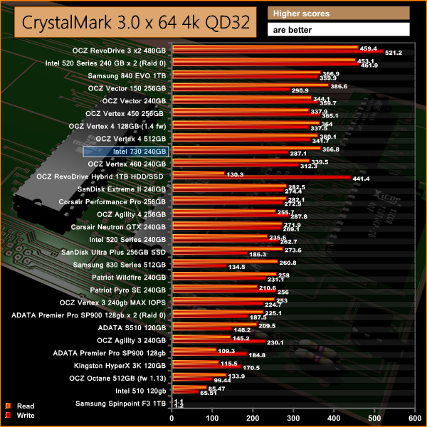 4K QD32 performance is excellent, rated in the top half of performance drives we have reviewed in the last year. As stated earlier in the review, the sequential write performance of the 240GB drive is rated around 270MB/s which is 200 MB/s less than the 480GB model.