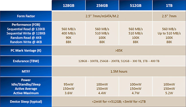 Micron claim that the drives will deliver up to 560 MB/s sequential read and up to 510 MB/s sequential write speeds. The 128GB version however suffers a little due to the layout configuration – peaking at 400 MB/s write. IOPS performance for all drives is certainly commendable, with rated figures quoted between 90k and 100k (read) and 88k (write).