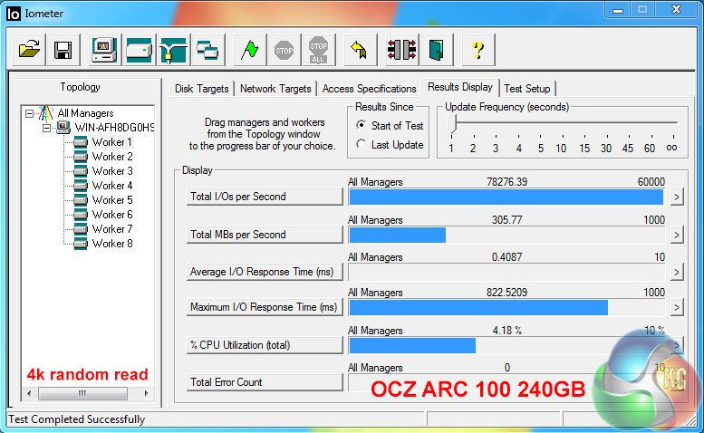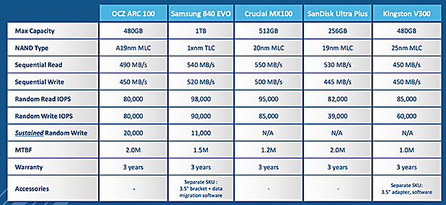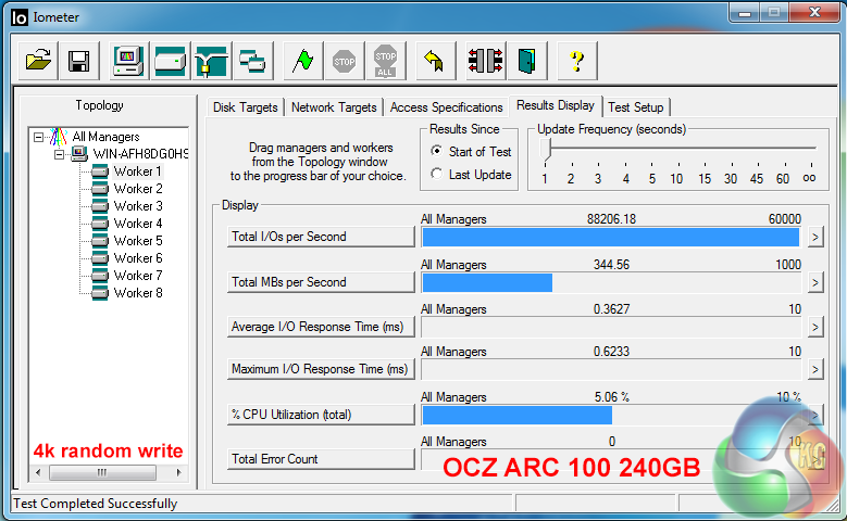 OCZ are focusing on the long term sustained write capabilities of the ARC 100 SSD. They sent over an IOMETER icf file just before launch named ‘precondition_12hr.icf' which they recommended we include in our tests today. We did test both OCZ ARC 100 240GB and Samsung 840 EVO 1TB drives with these settings and our results were very close to those in the table above. We need to look into this a little further before we include these results in our own SSD reviews from this point onwards however.