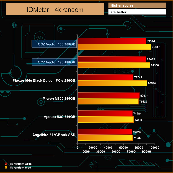 IOPS performance falls a little short of OCZ's official claims of 100,000 read and 95,000 write. Both 480GB and 960GB drives performed to a similar level in our own tests, scoring (approximately) 90,000 write and 95,000 read. These are great results and we would point out that the differences are likely related to variances in testing methodology.