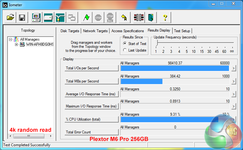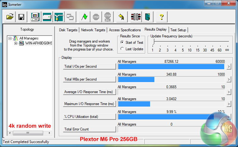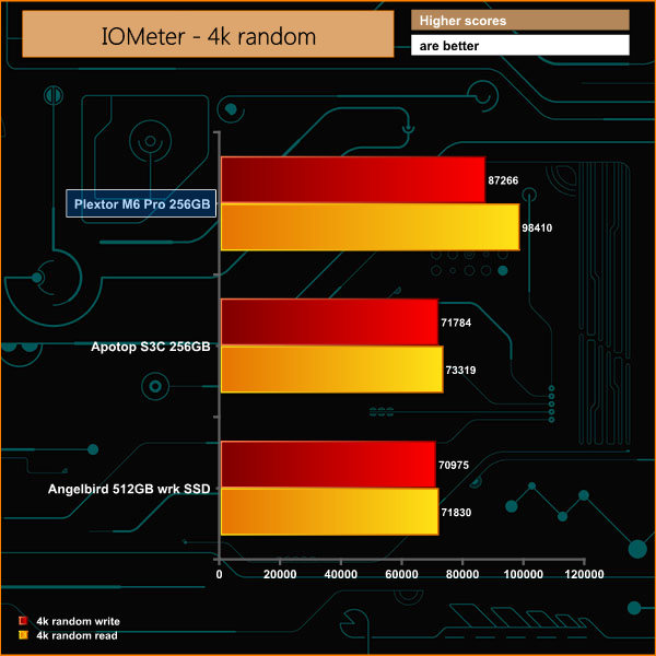 Plextor's own tests rate random 4k IOPS performance at 100,000 random read and 86,000 random write. Our own results are very close, hitting 98,410 read and 87,266 write.