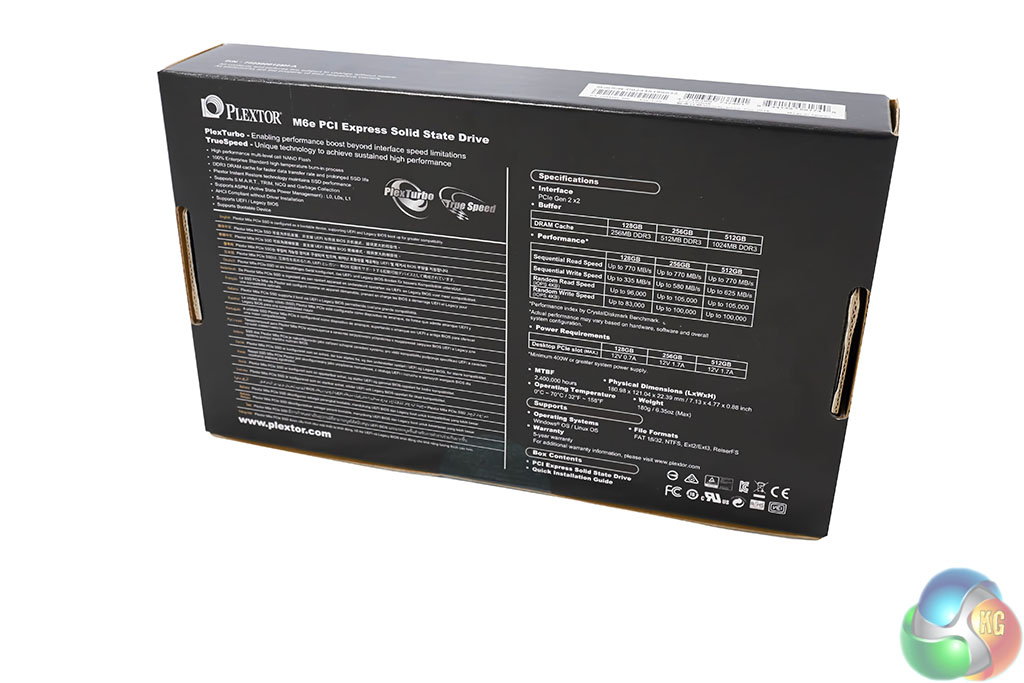 The Plextor M6e Black Edition PCIe 256GB ships in a rather large black box with some details on the front. The Plextor PR team have been keen to push the fact that drive can be upgraded easily enough and that the newest versions of the software, along with PlexTurbo 2.0 can be downloaded. More on this later.