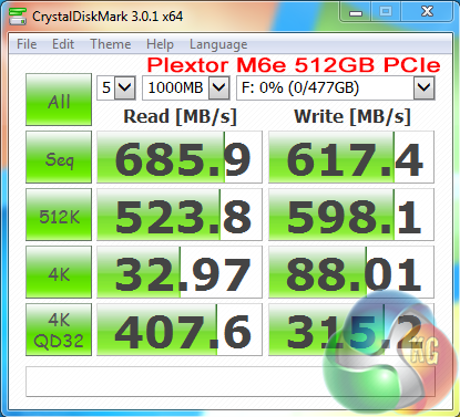 Crystalmark is a useful benchmark to measure theoretical performance levels of hard drives and SSD’s. We are using V3.0.1 x64.