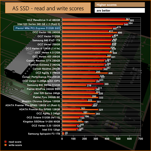 AS SSD only deals with incompressible data. This shows the strength of the Marvell controller in the Plextor M6e PCI Express 512GB SSD. The drive rates right at the top of our performance chart.