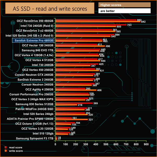 AS SSD deals exclusively with incompressible data and some drives score badly. No such concerns for the Sandisk Extreme Pro 480GB – the overall score of 1172 is one of the highest we have ever recorded from a single drive.