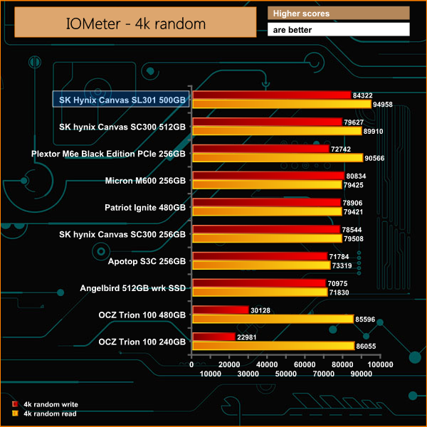 IOPS performance is fantastic scoring almost 95k in the 4k random read test and 85k in the random write test. This positions the drive right at the top of our chart, producing the most consistent results.