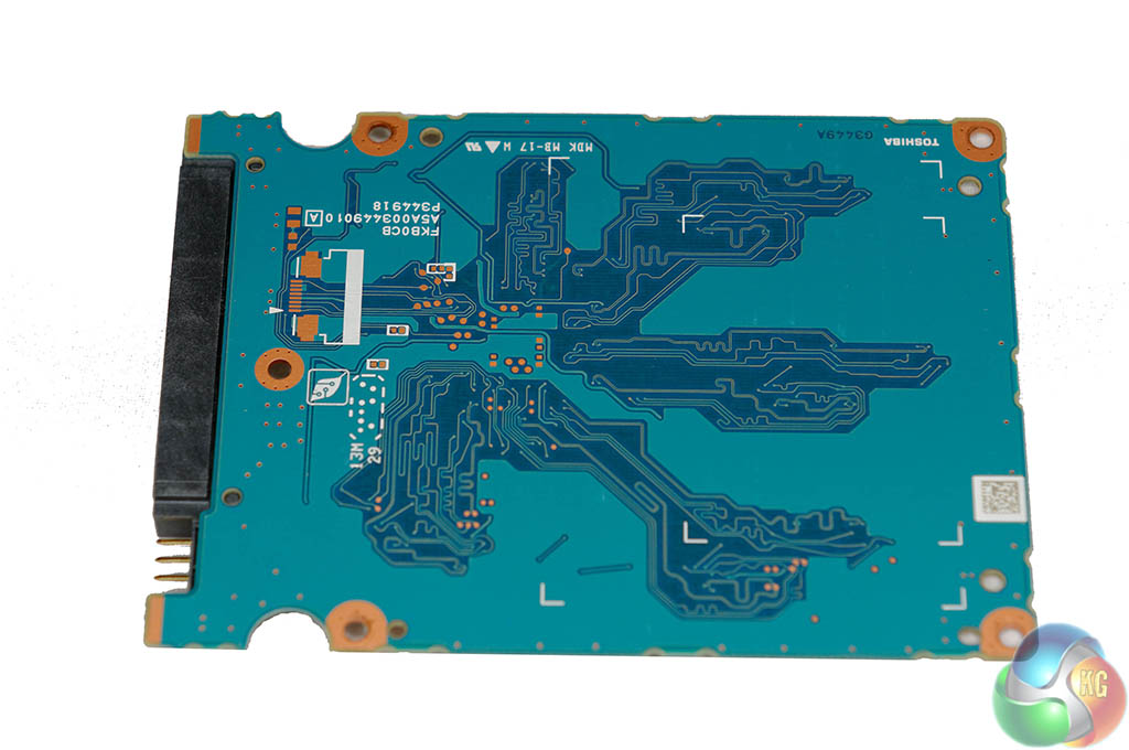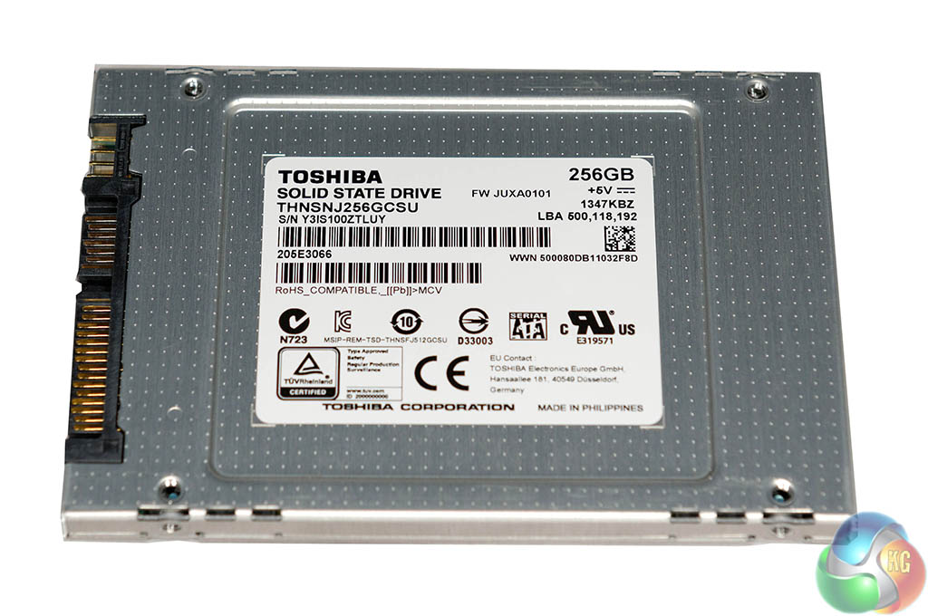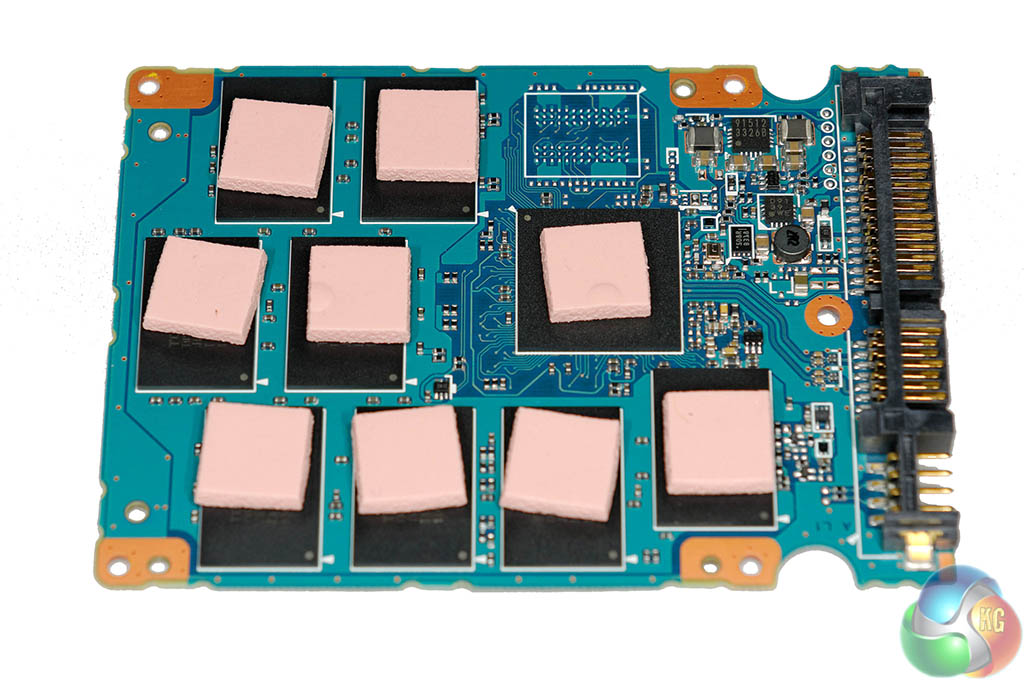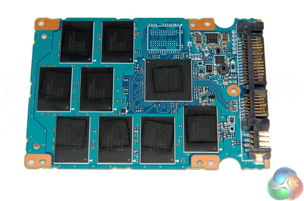 One side of the PCB is bare and would be populated with additional NAND if this was the 512GB model of the drive. This 256GB version ships with eight 32GB memory chips on one side. These are Toshiba Advanced 19nm (A19nm) toggle 2.0 MLC (Multi level cell) NAND. The drives include Adaptive Size SLC Write cache technology and optional Self Encrypting feature compliant to TCG-Opal 2.0.