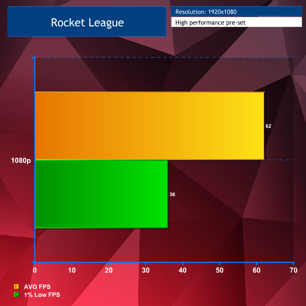 Rocket League on the high performance preset at 1080p averaged 62FPS with 1% lows of 36.