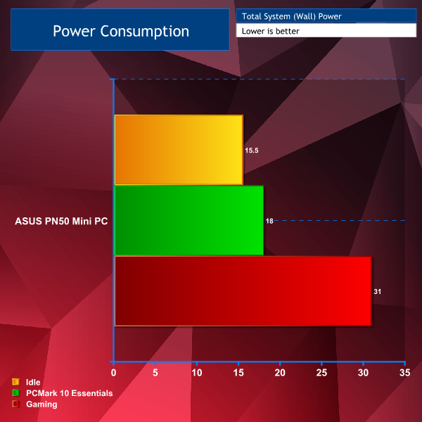 Finally, power consumption, I was impressed with just how little power this system drew during our PCMark 10 test and even while gaming. Idling at just under 16w was also impressive too.