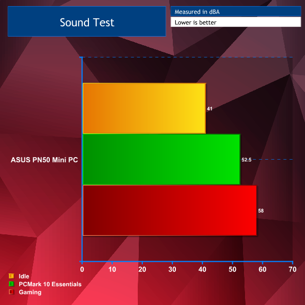 Sound wise the PN50 is actually almost silent, despite idling around 41dBA the ambient noise in the room wasn’t far off of that and I could only hear the fan in the PN50 kick in during gaming.
