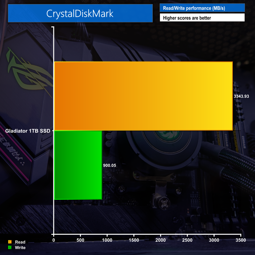 Running our SSD through CrystalDiskMark benchmarking did show a depressing write speed, dropping all the way down to 900MB/s while our read speeds remained high. That is disappointing, but for real world gaming we can't say we noticed it causing any problems.