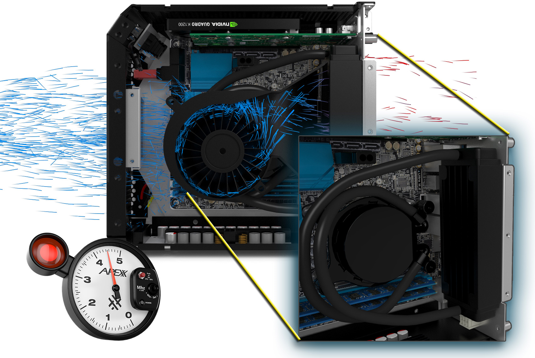The Apexx 1 system can be equipped with up to 64GB of ECC memory, one high-end solid-state drive in M.2 form-factor (with PCIe 3.0 x4 interface), two 2.5” HDDs or SSDs. Due to size constraints, the system is only compatible with small form-factor professional graphics cards from AMD and Nvidia. The fastest adapter that Boxx offers is Nvidia’s Quadro K1200 with 4GB of memory. All Apexx 1 configurations include USB 3.0 ports, Gigabit Ethernet, and Wi-Fi 802.11ac wireless connectivity.