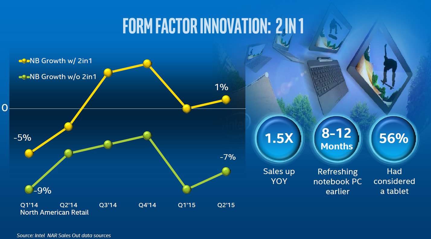 It is noteworthy that Intel now pins a lot of hopes on sales of 2-in-1 hybrid devices, which are gaining popularity in North America and which shipments in the region were up 50 per cent year-over-year in the recent months. According to the chip giant, 2-in-1s have already helped the notebook market to grow slightly in late 2014 and early 2015. Intel claims that such hybrid PCs are driving sales of mobile computers in general because of very short refresh cycles: between eight and twelve months.