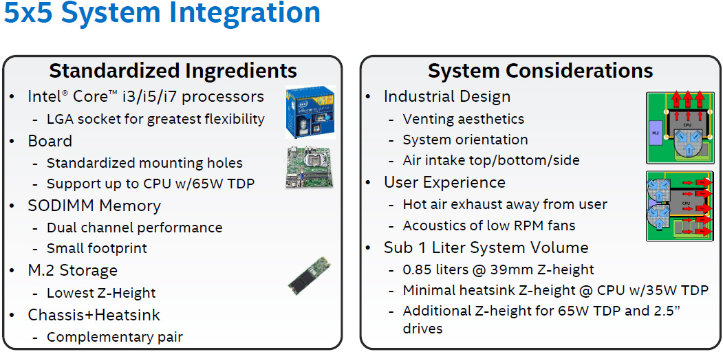 Intel’s 5×5 is an all new form-factor for upgradable personal computers that has around 0.85 liters volume and around 39mm height. The core component of the 5×5 platform is a new mainboard with 140mm*147mm (5.5”×5.8”) dimensions, around 30 per cent smaller than mini-ITX, but considerably larger compared to motherboards inside NUCs. The mainboard has an LGA socket, two SO-DIMM slots, an M.2 connector for solid-state drives, a port to plug Wi-Fi/Bluetooth card, a SATA port, two USB 3.0 connectors, two HDMI outputs, Gigabit Ethernet and so on.