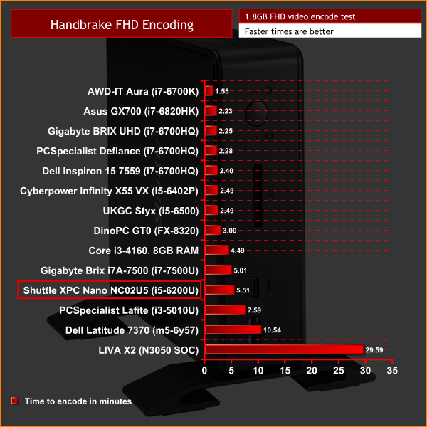 In Handbrake, the i5-6200U is also not too far off the newer i7-7500U. A total encode time of 5:51 is not breathtakingly fast, but it is decent for such a small device.