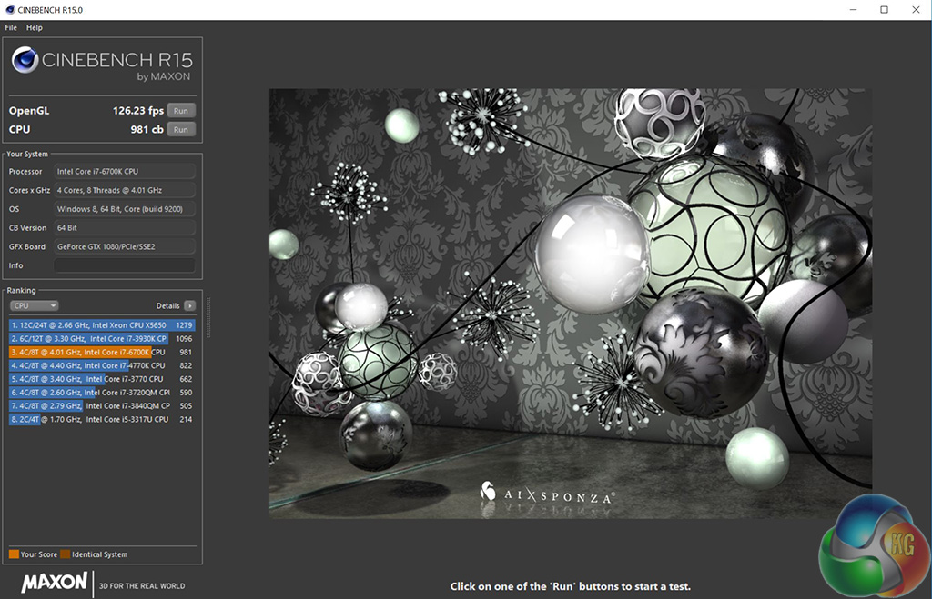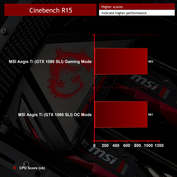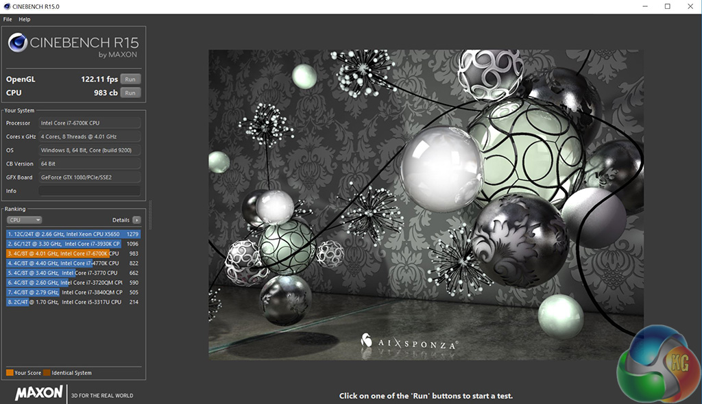 Cinebench R15 scores of just under 1000 points indicate good rendering performance from the overclocked Core i7 6700K CPU.