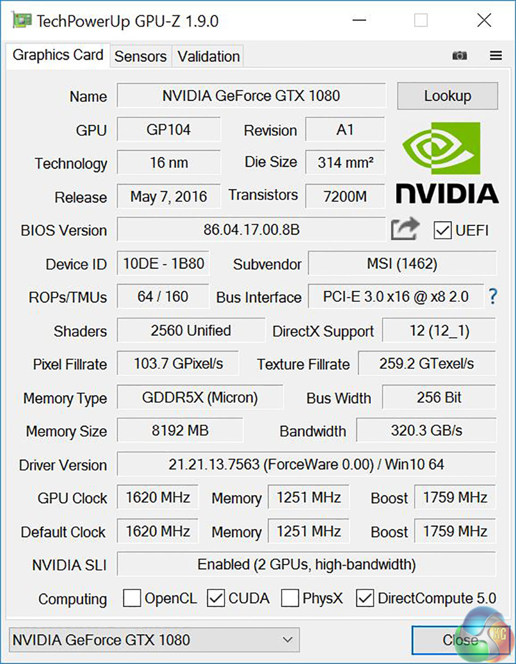 Those GTX 1080s are clocked at 1,620MHz base and 1,759MHz boost with GDDR5X at 1,251MHz.