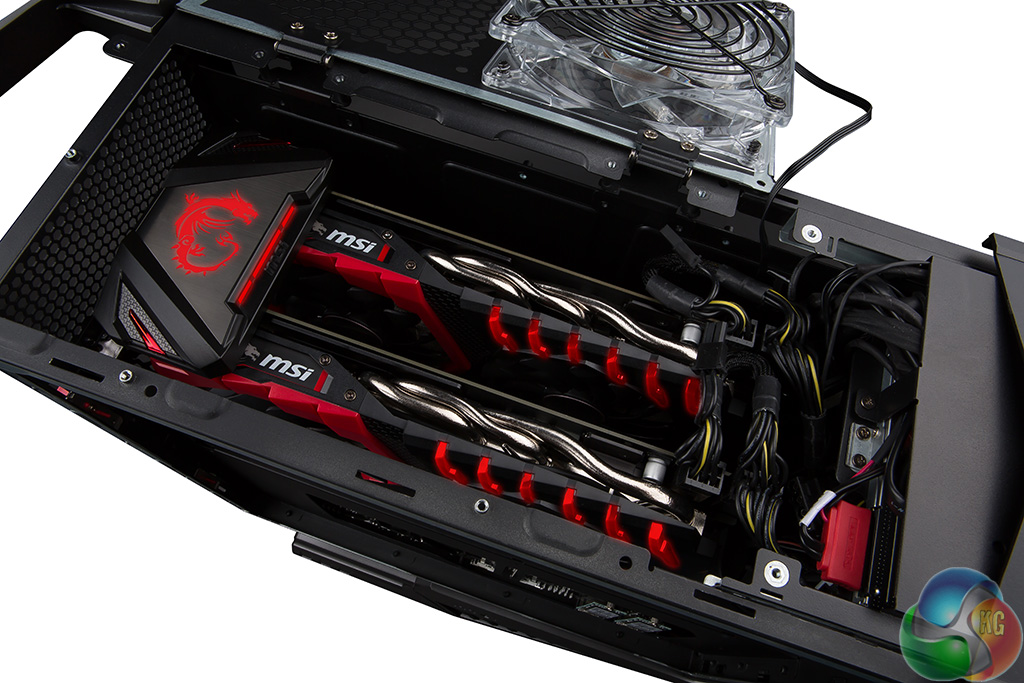 The main chassis has been divided into chambers that help the cooling air to flow where it is required so the Core i7-6700K and its liquid cooler are housed in one area and the dual graphics cards are situated in another.