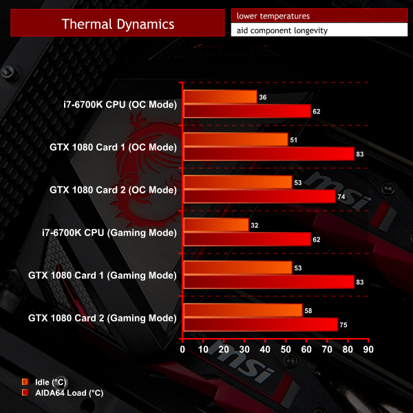 MSI has employed four 120mm fans on the front and top edges of the case and divided up the main compartment with the result that Aegis Ti cools superbly well. One graphics card was consistently ten degrees hotter than the other under load which shows the limitations of air cooling in a small chassis.