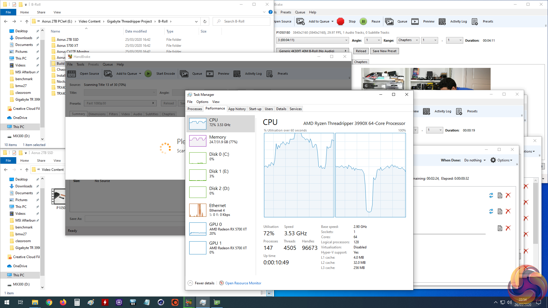 The system performed very well with CPU and GPU rendering and heavy multi-tasking. I was particularly happy with the ability to run consecutive Handbrake video conversion queues by leveraging the 64-core processor. This is an area where a system such as this would really benefit in our day-to-day video editing workloads.