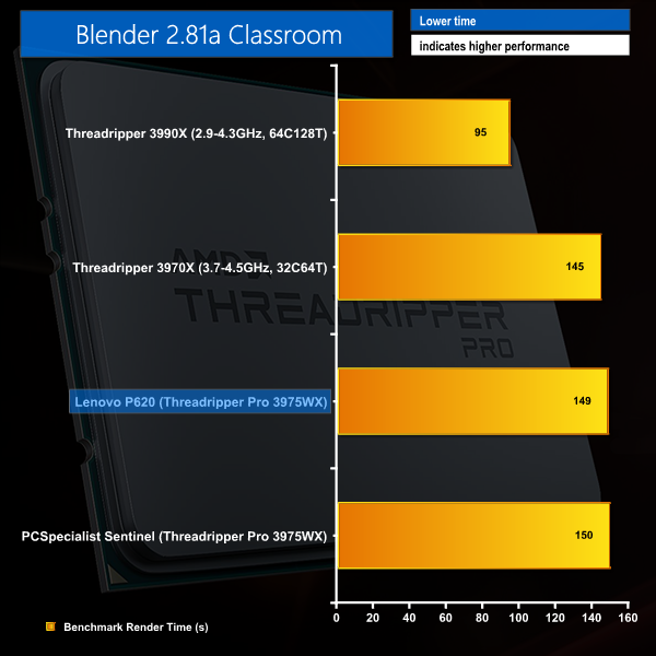 Blender Classroom also puts the P620 close to the PC Specialist Threadripper Pro system and slightly behind the better cooled non-Pro Threadripper comparisons. For reference, the Radeon Pro W5700’s GPU compute time was 231 seconds – over 82 seconds slower than the 32-core CPU. That similar trend was observed with the BMW Blender test with AMD’s CPU beating out the chosen GPU convincingly.