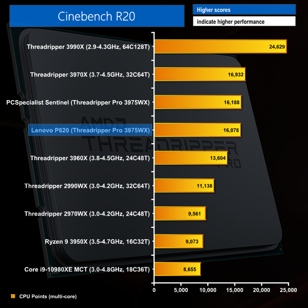 Cinebench R20 has the 3975WX in Lenovo’s P620 scoring just over 16,000 points in multi-threaded and the 500 points typical of Zen 2 for 1T. For reference, Cinebench R23 nets 41,000 multi-core points and 1282 for single core.