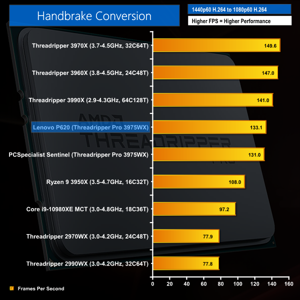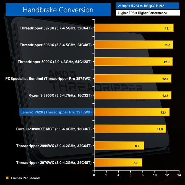 Another couple of tight scores are seen between the two Threadripper Pro 3975WX systems in Handbrake. With that said, the H265 test was a little slower on Lenovo’s P620 which is likely attributable to clock speed consistency for the long run.