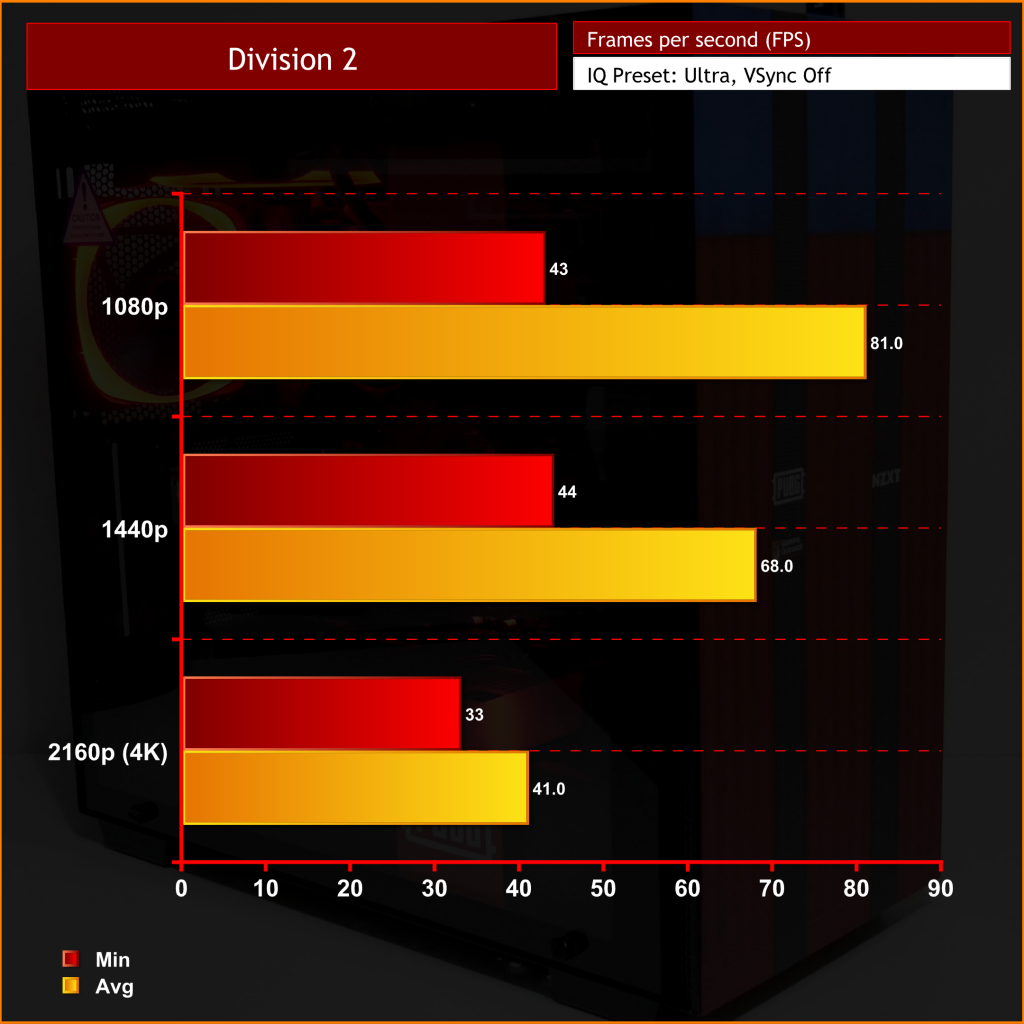 When it came to The Division, this proved the more demanding title – especially at 4K, where we only managed to achieve an average of 41.0fps. However, we did see 81.0fps at 1080p and then 68.0fps at 1440p.