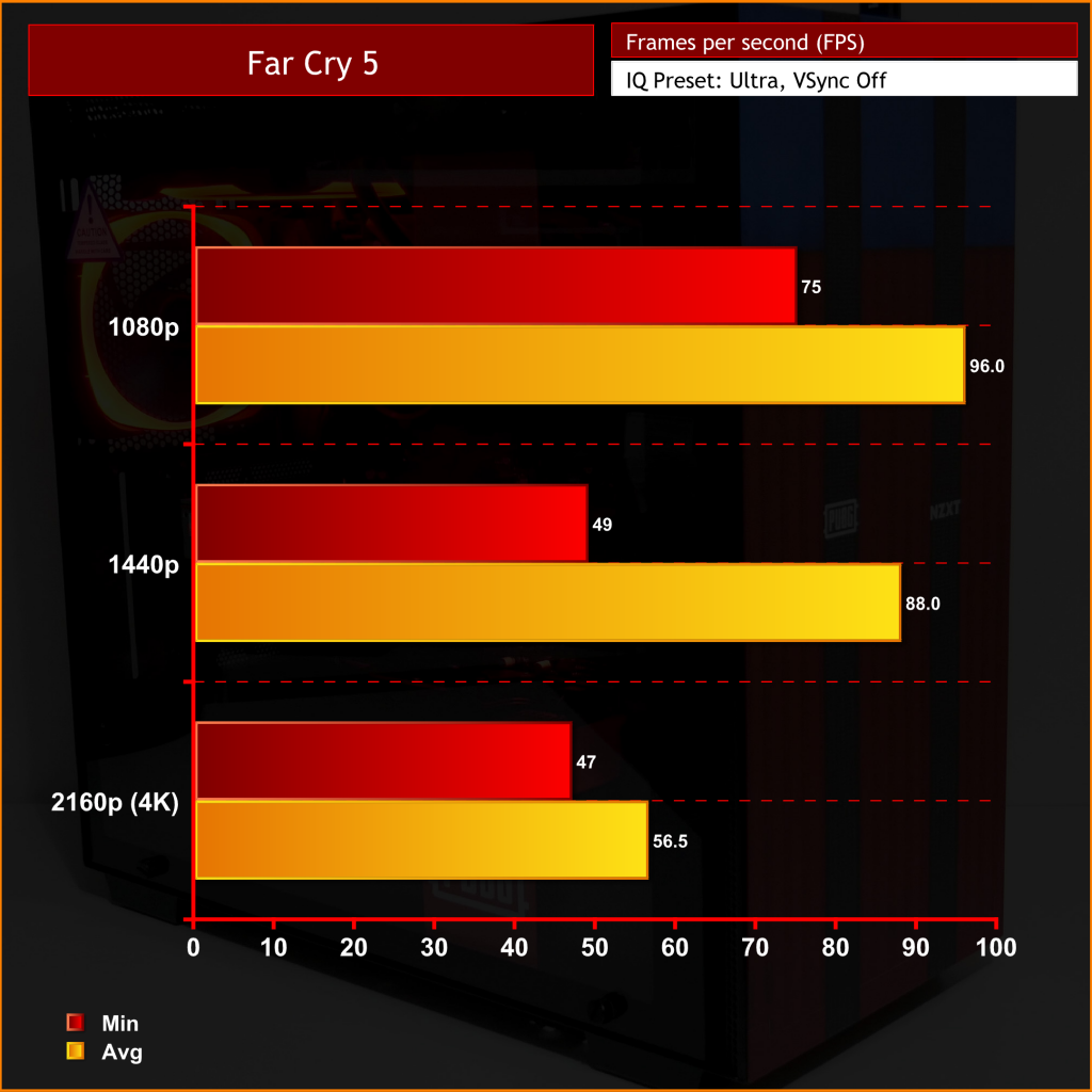 As you can see while playing Far Cry 5, we managed to get an average of 96 frames per second at 1080p, 88fps at 1440p and then 56.5fps at 4K resolution.