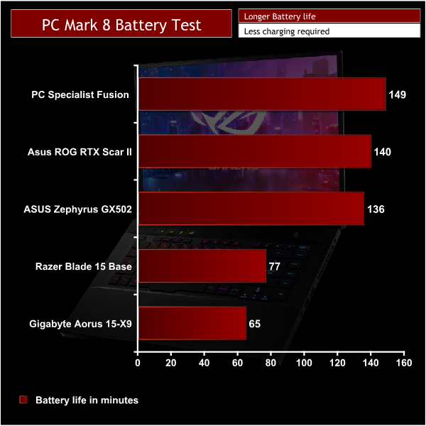 To test battery life I used the ‘Home’ benchmark in PCMark 8. This test isn’t hugely demanding when it comes to computational requirements and, although artificial, it is likely to simulate the sort of stress the laptop would undergo while doing a small amount of video editing, web browsing and word processing. I set the screen brightness to 100%, and the keyboard brightness to 100%.