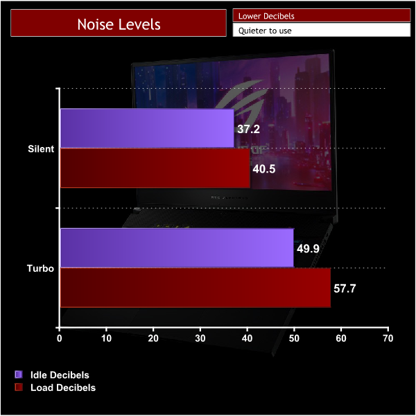 I took decibel readings while the Zephyrus was in both the silent and Turbo profiles which cater to two different scenarios. Fan noise on this laptop isn't as loud as some I have heard but the fans do constantly make an audible noise even in the slightly more restrictive silent profile. However you can do more taxing tasks without much of an annoyance at the expense of reduced performance.