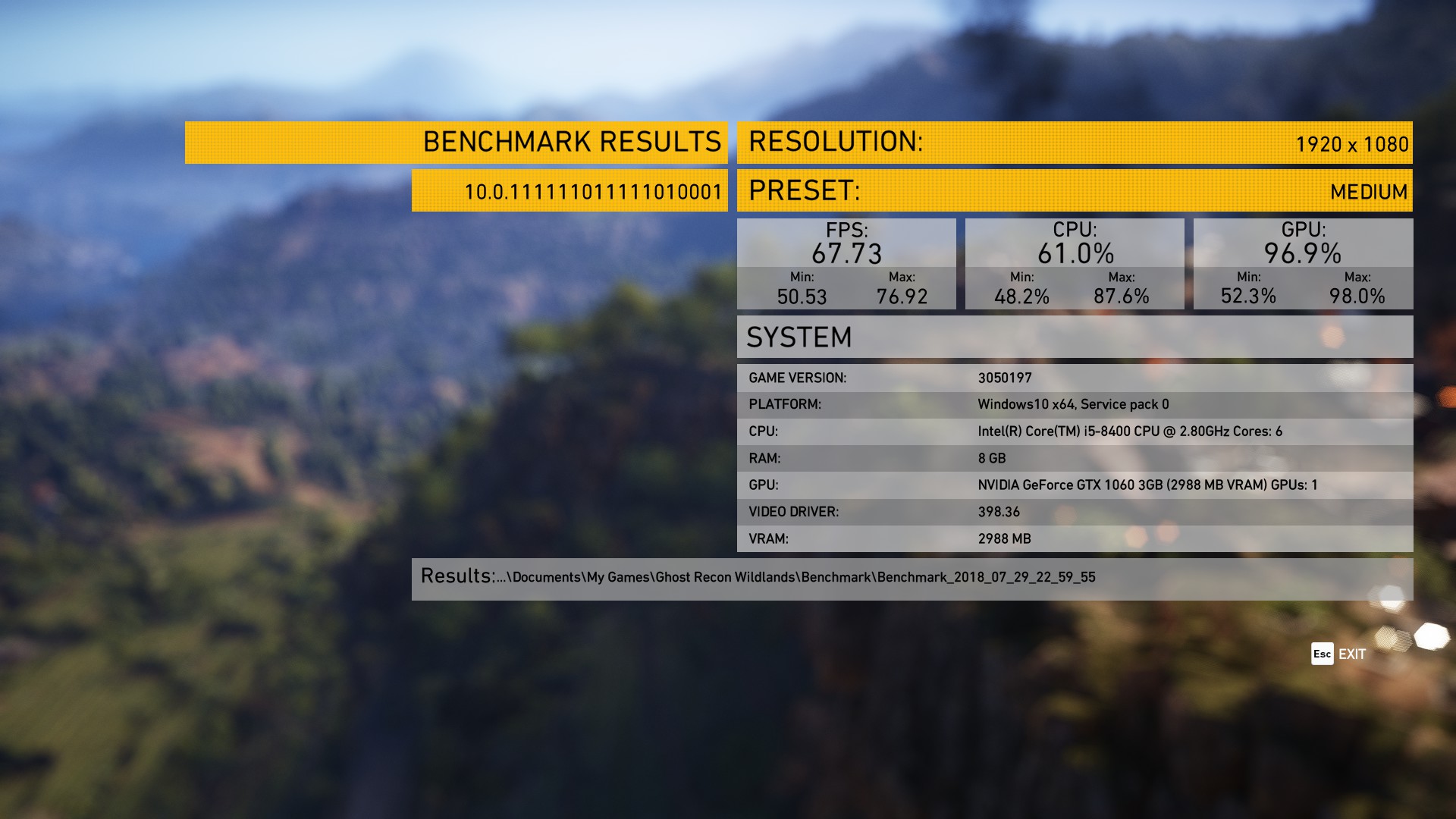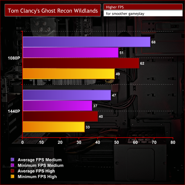 Tom Clancy’s Ghost Recon Wildlands is a game with a superb open world environment. The beautiful scenery of mountains, forests and deserts requires a lot of GPU power to render, particularly on high settings. This demanding game is perfect for testing this PC’s gaming performance.