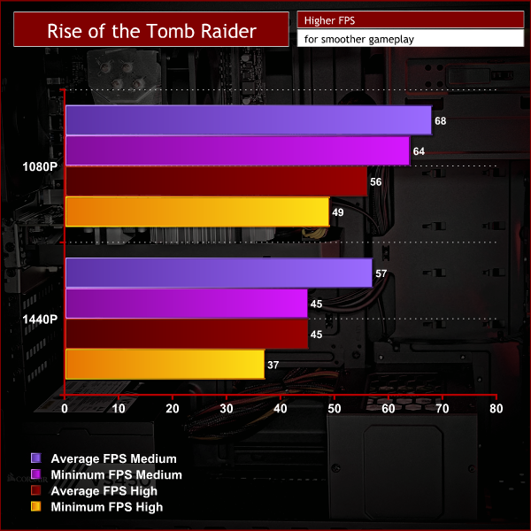 Rise of the Tomb Raider is an action adventure game with many different environments and immersive landscapes making it a useful way to test this PC’s gaming performance.