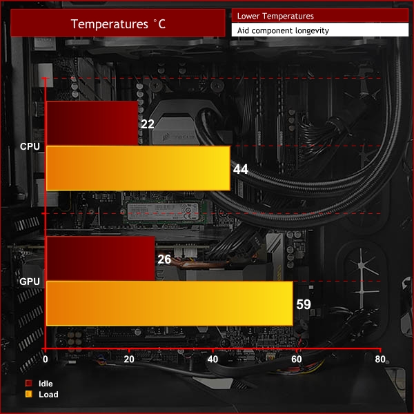 The cooling tests were very impressive. The Corsair H100i V2 didn't break much of a sweat keeping the Ryzen CPU below 45 degrees. Meaning there's plenty of room for a potential overclock to make the most out of the Ryzen 7 1700. The Mini Zotac 1070ti is air cooled and with the help of the 3 front case fans on the corsair 460x it stayed below 60 degrees. The Magma LX has good airflow to keep all the components cool while gaming for extended periods of time.