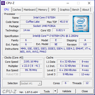 This laptop uses the hexa-core i7-8750H processor which has a base clock of 2.2GHz but will turbo boost up to 4.1GHz under load on a single core.