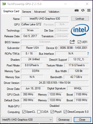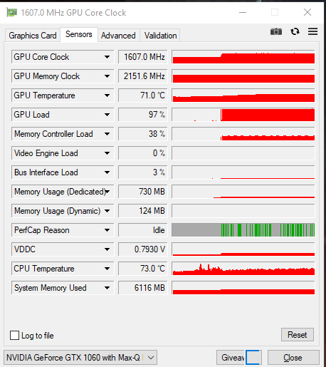 The 16GB of memory is DDR4 and runs at a speed of 2667MHz. The GPU-Z screenshots show both the Intel integrated graphics and the dedicated Max Q Nvidia GTX 1060. The Max Q GTX 1060 features 6GB of GDDR5 memory and has a default clock of 1265MHz and a rated boost clock of 1480MHz. However, during testing we did notice the boost clock peaked at nearly 1750MHz and levelled out around 1600Mhz which is rather impressive and makes it a very fast Max Q GPU.