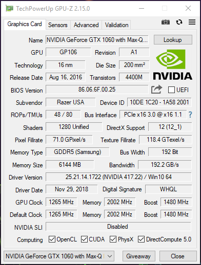 - Graphics: NVIDIA® GeForce® GTX 1060 Max-Q Design 6GB