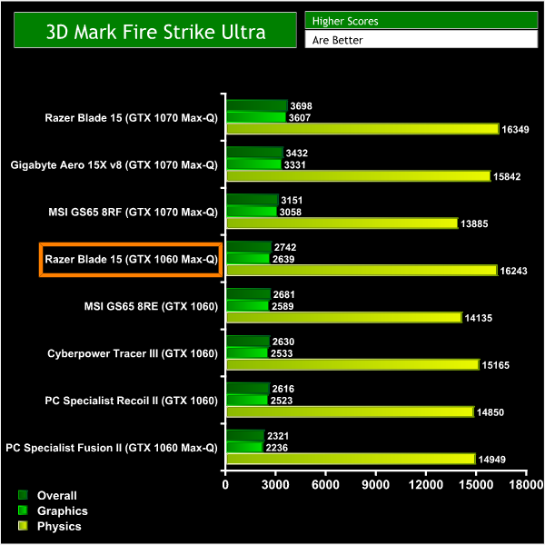 For this test, we ran the Razer Blade 15 through Fire Strike, Fire Strike Ultra and Time Spy. In the graphs below you can see it compared against similar laptops. Even though they all have similar specifications, slight variations in boost clock speeds caused by fluctuations in temperature have an impact on performance.