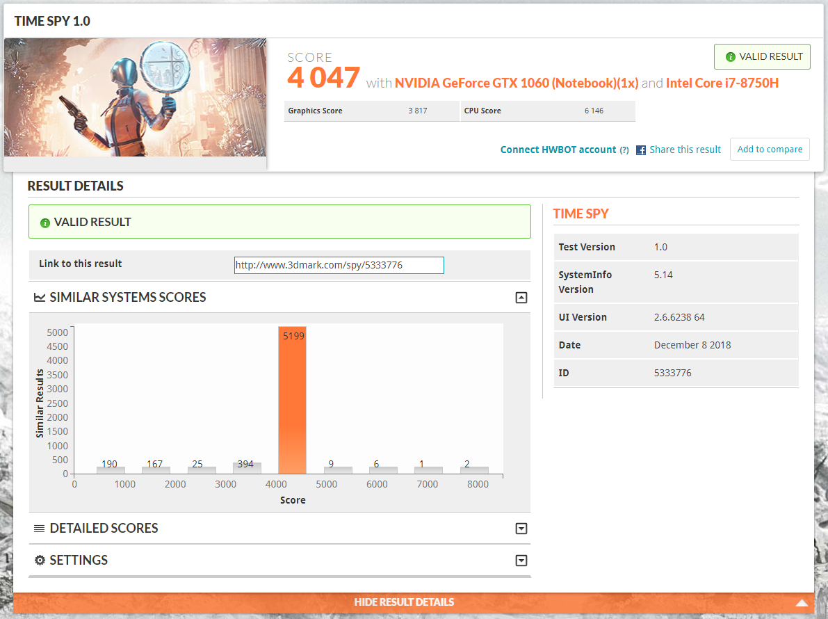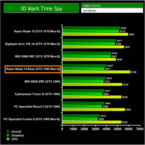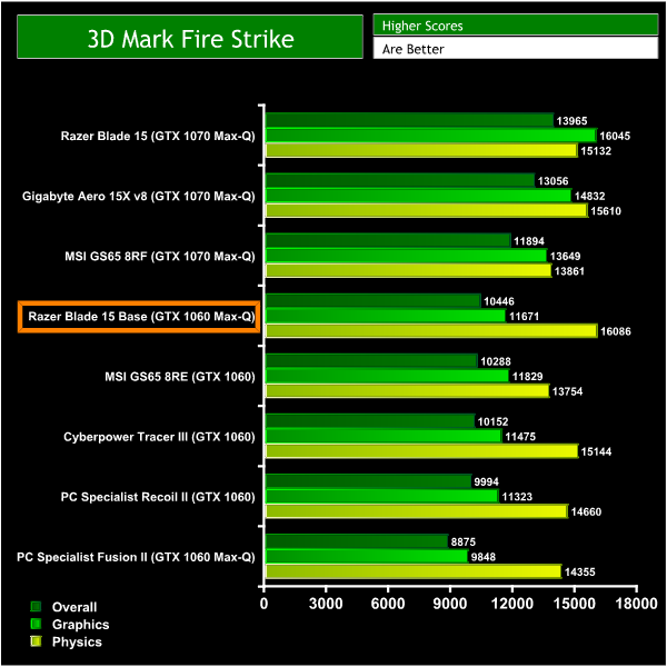 The 3D Mark scores coming from this laptop are very impressive. It managed to overtake laptops featuring the full fat GTX 1060 even though the Blade 15 only features the Max Q model. The maximum boost clock of 1746MHz and good cooling mean the GPU can perform to its full potential and produce some great results.