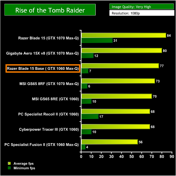 Results from the games testing are just as impressive as the results we saw from 3DMark. The Max-Q GTX 1060 in the Razer Blade 15 Base is putting in work to give some really great frame rates – despite being a MAX-Q chip, this 1060 was simply boosting well beyond MAX-Q specification, to the point where it matched or outperformed full-fat GTX 1060 laptops.