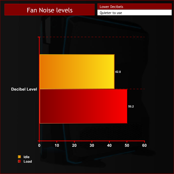 We measured fan noise levels using a sound meter while the PC was idle with no programs open, and then during AIDA64 testing to get a reading with the system under load.