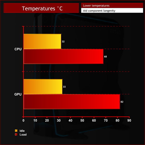 Idle temperatures are very good with both the CPU and GPU sitting at just over 30C. The CPU stays under 70C when stressed so it appears Zotac has done a good job when it comes to cooling the i7-7700.