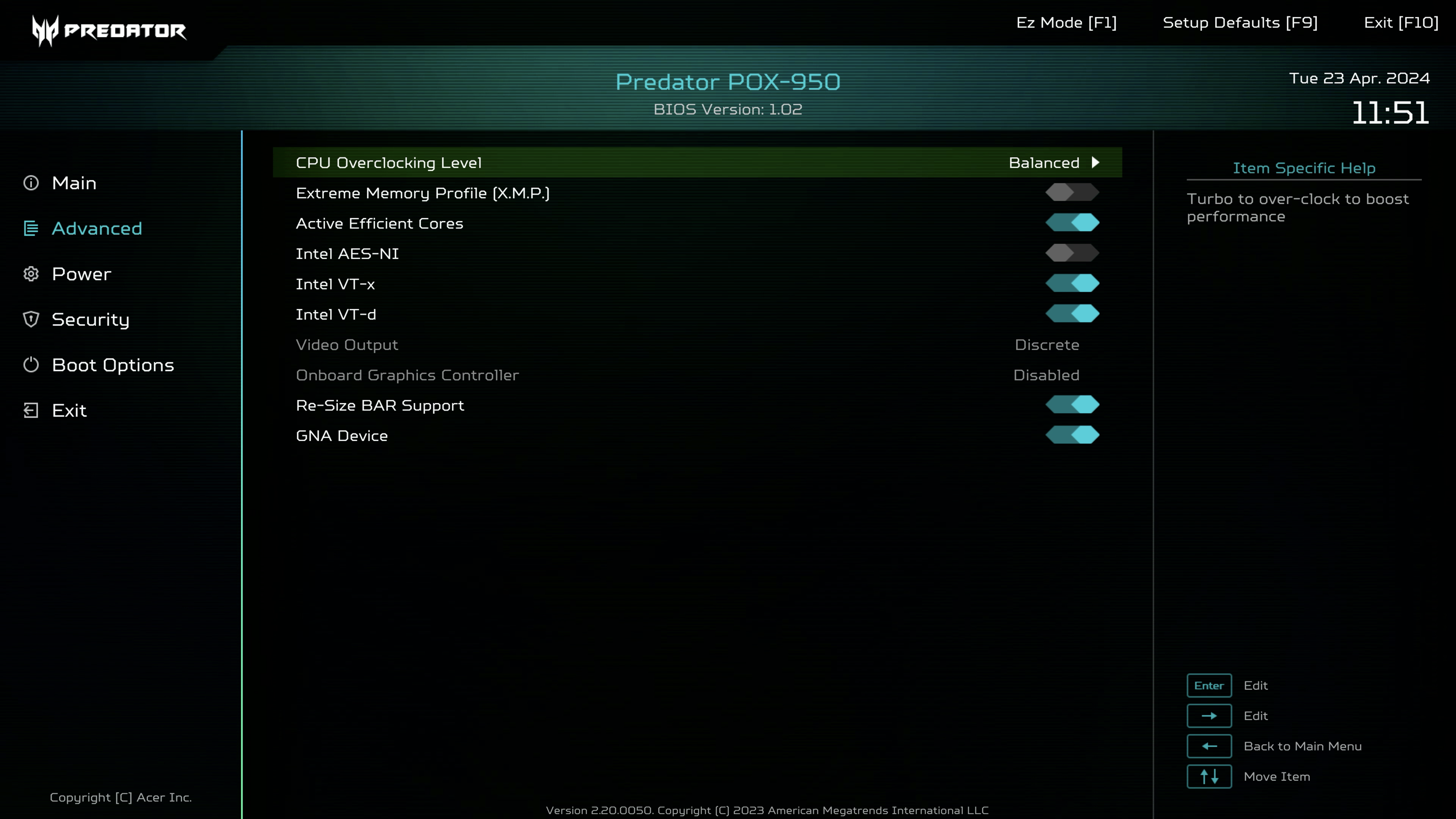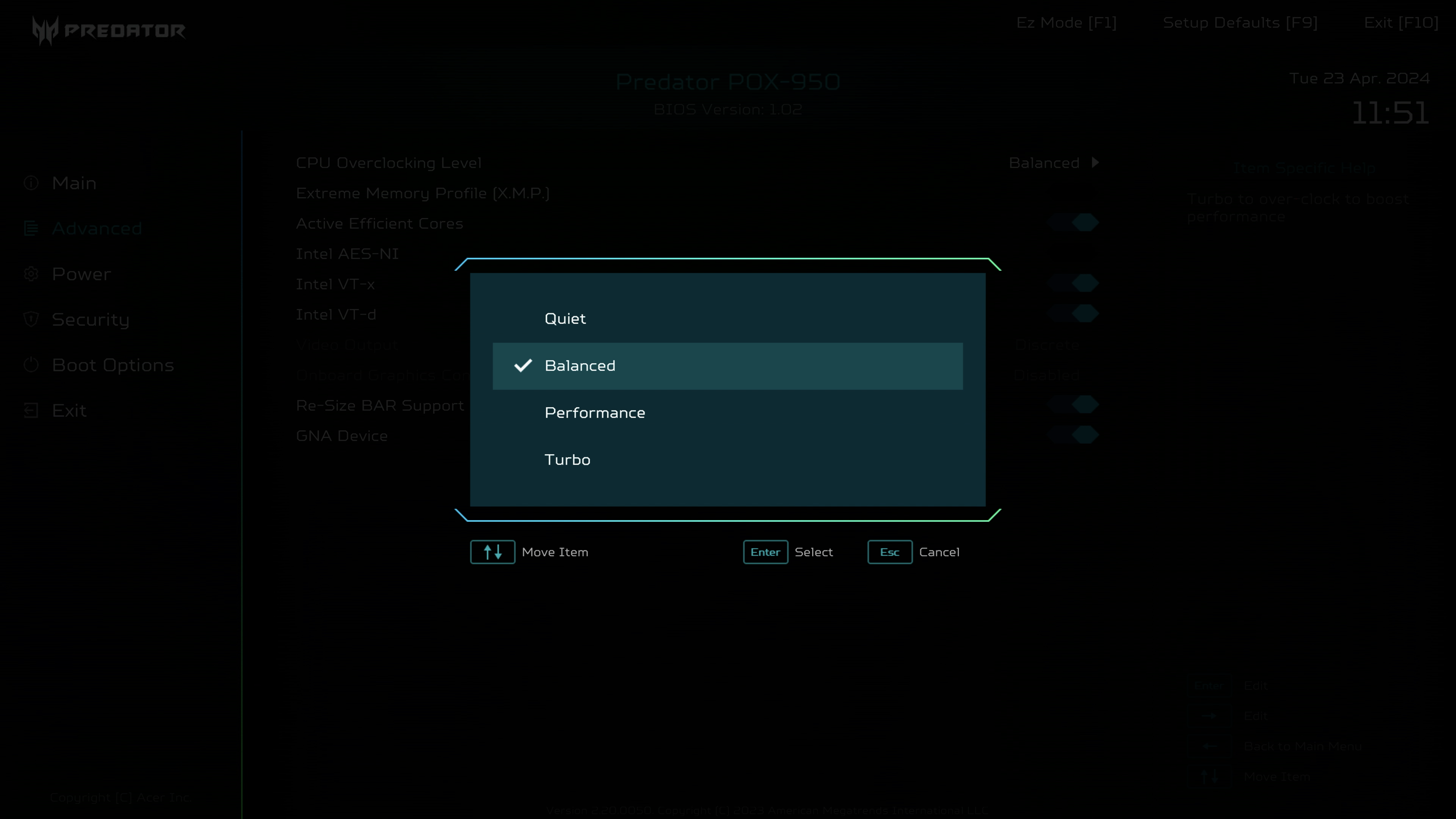 At this point, I had a look in the BIOS to see if it was possible to over-ride the fairly restrictive 150W PL1 figure and found that there were barely any actual CPU settings that can be adjusted – you just get the choice of the same four modes that are available within the PredatorSense software.