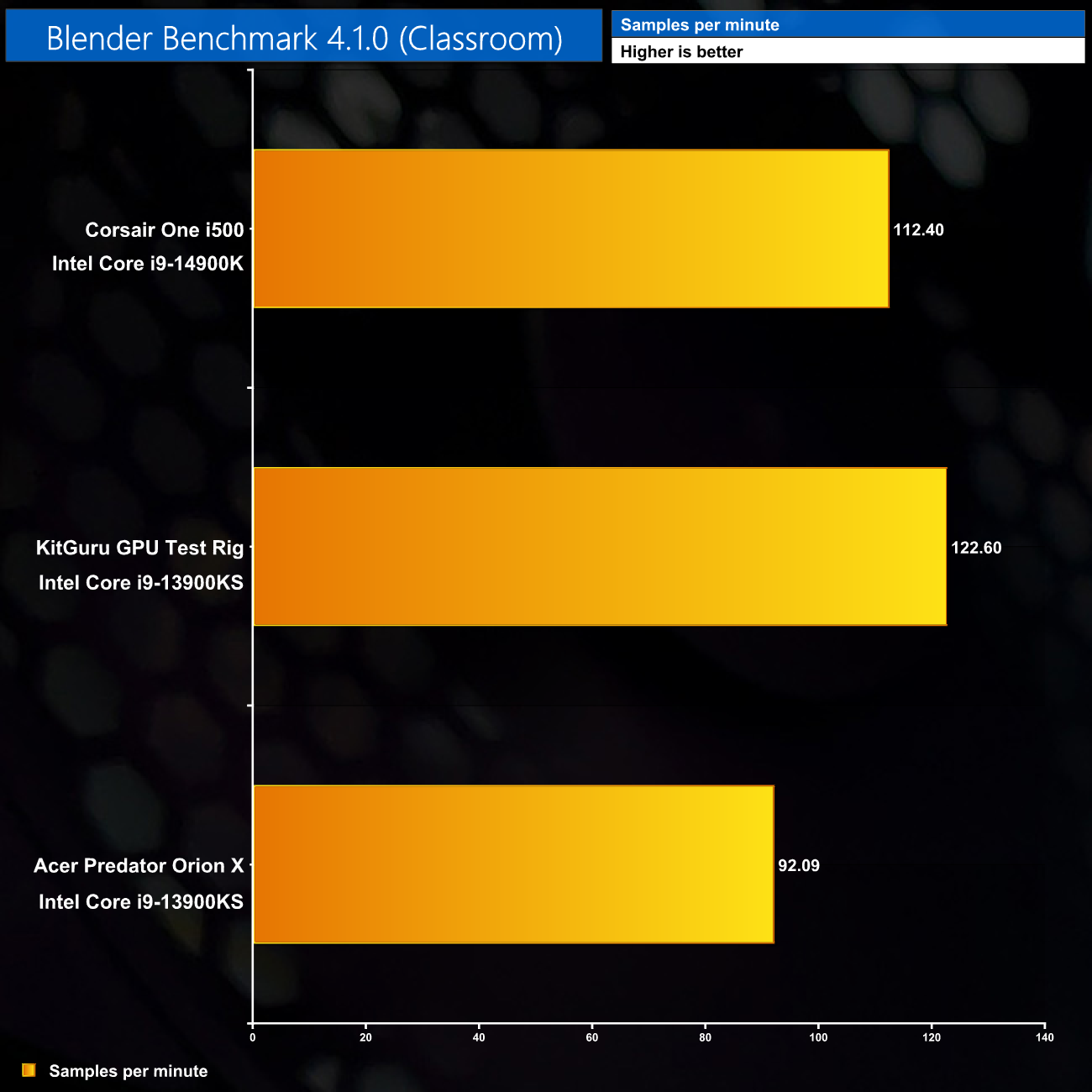Blender is another all-core workload however, and it's again a huge gain for the KitGuru test rig considering both systems use the same CPU – we see a 25% reduction in performance on the Orion X.