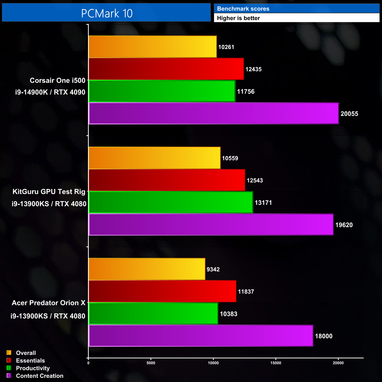 PCMark 10 follows a similar trend, though the margins aren't quite so large – across all four metrics, the Orion X comes in slower.