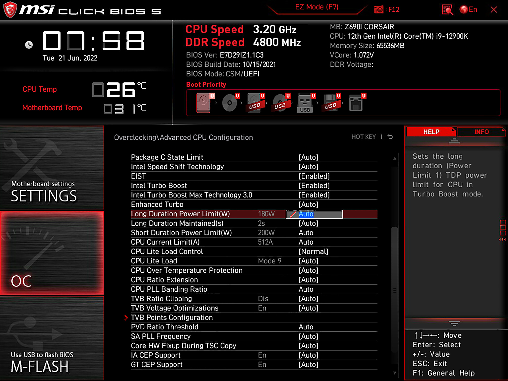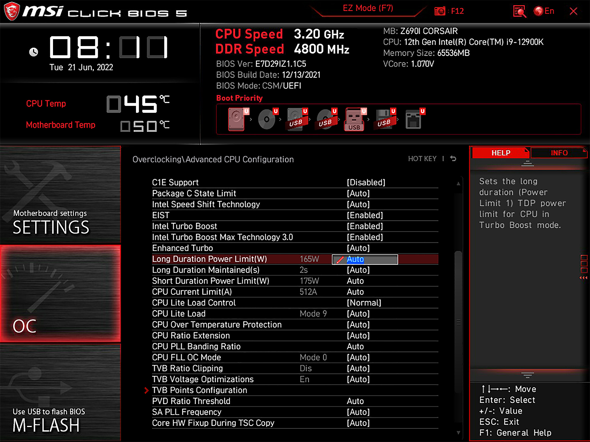 Updating to the latest BIOS – EZD29IZ1.1C5 – resulted in the Long Duration power limit now showing 165W, in accordance with Corsair's reviewer's guide. This BIOS version is the latest one available and can be downloaded through Corsair's website, though it is still only dated to December 2021, so it is not especially recent.
