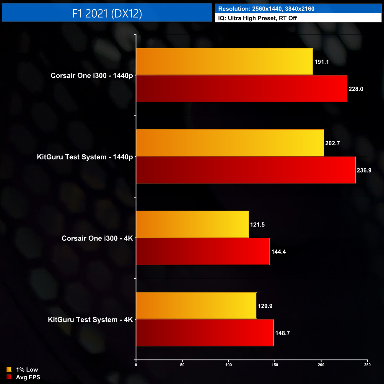 Overall, gaming performance is excellent from the Corsair One. It is on average just 3% behind our GPU test system – a proper mid-tower gaming PC – and delivered great frame rates across the board. The RTX 3080 Ti is one of the fastest graphics cards on the market right now and would pair very nicely with either a high refresh-rate 1440p, or even 4K, gaming monitor, as we can see from the average results shown above. In fact, of the ten games tested, only two – being Cyberpunk 2077 and Total War: Warhammer III – were unable to average above 60FPS at 4K, so that tells you pretty much everything you need to know about the gaming performance.