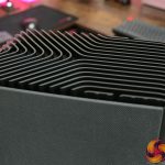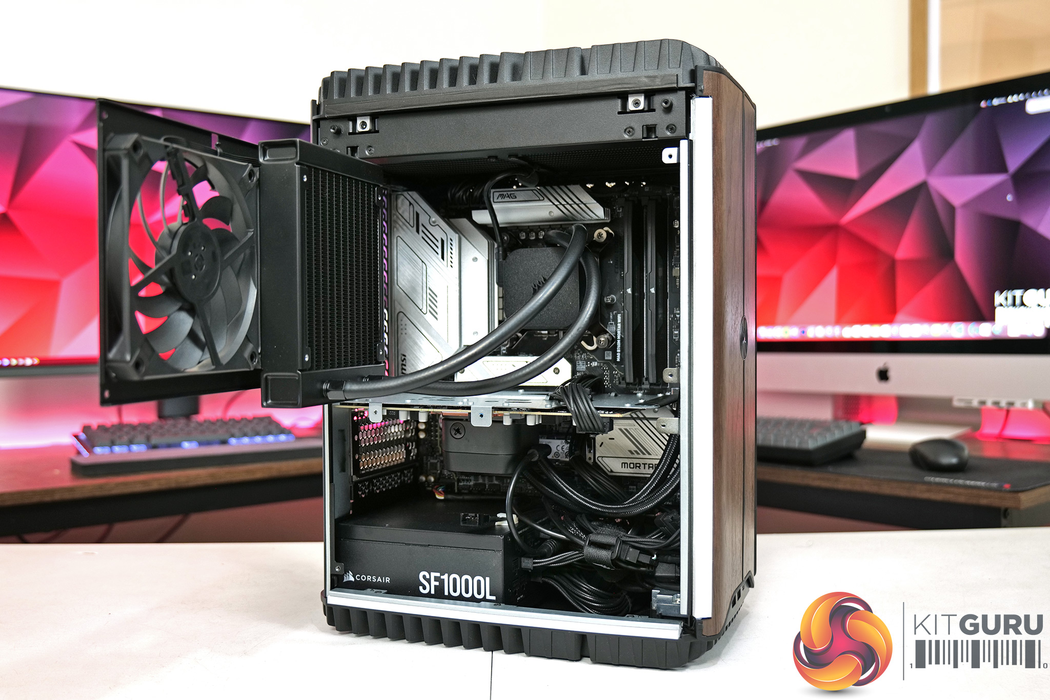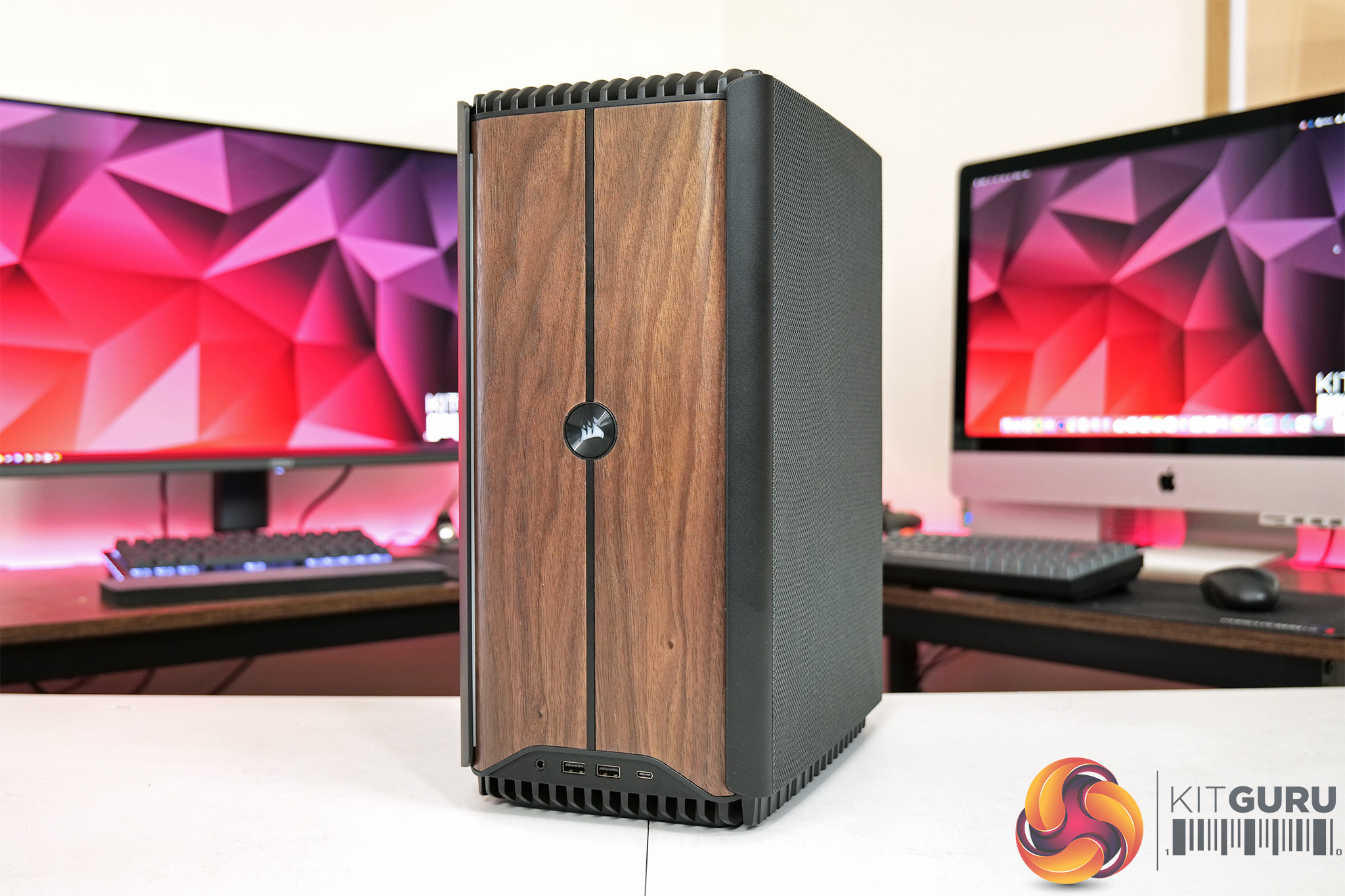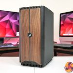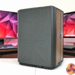 Starting with a tour around the system then, Corsair is offering the One i500 in two colours – I have the Wood Dark option, with a walnut front panel and dark aluminium panels, but there is a Wood Light option too. The power button sits right in the heart of the front panel, and those vertical strips in the wood are not just decorative – they are actually touch sensitive and can be used to change the RGB lighting without the need for software, which is a very cool addition.
